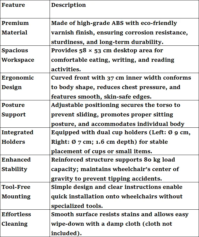 This wheelchair table board, with a compact and practical design, can be easily fixed on the wheelchair, which is stable, and not shaking. It is made from environmentally friendly material and features a smooth, easy-to-clean surface. It can be used to hold meals, books, or electronic devices, offering a convenient and comfortable dining and working experience for individuals with mobility disabilities. Overall, it enhances the quality of life by making day-to-day activities more manageable and enjoyable.